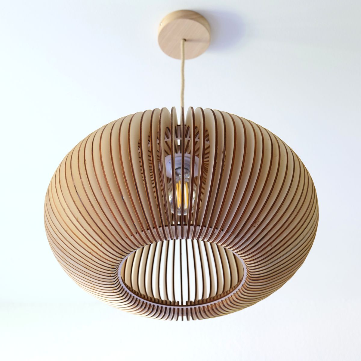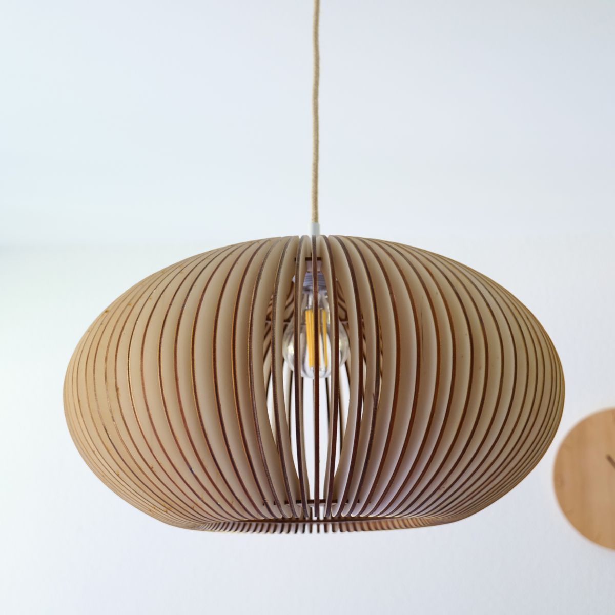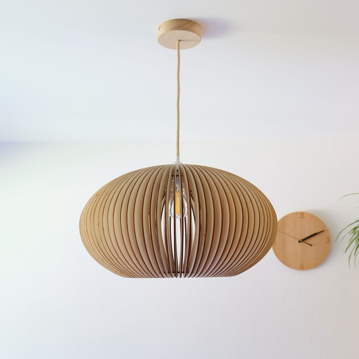 Ovalo setzt mit seiner abgerundeten Silhouette und der präzisen Schichtung ein leises Statement. Handgefertigt aus sanft gebogenen Holzelementen spendet es warmes, stimmungsvolles Licht und wird zum Mittelpunkt in Essbereichen, Wohnzimmern oder offenen Räumen.